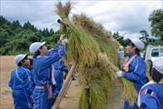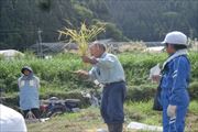 全校児童21名、高校生(航空高校)28名、地域の方々15名で黄金色に実った稲を刈り取りました。刈り取った稲は、運動場に運び、準備してあった稲架にかけました。