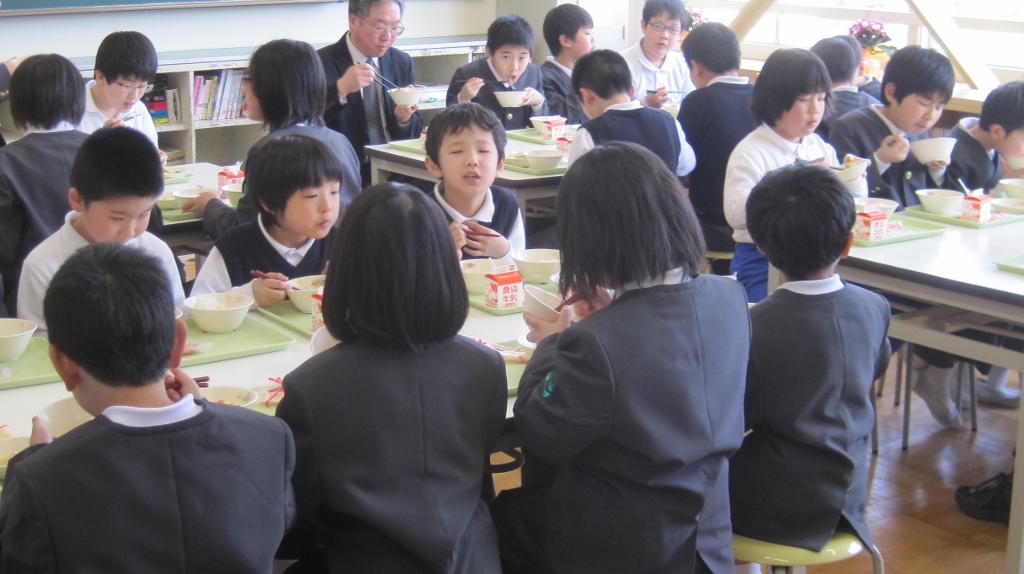 今日から給食が始まりました。今年は2階にランチルームを移してみんなでおいしい給食を食べました。1年生はとても喜んで食べていましたよ。