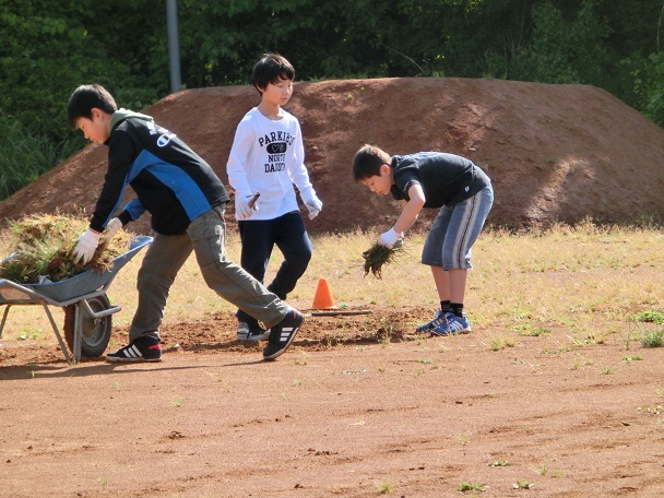 5月24日の「あての森総合運動会」に向けて学校では子どもたちは先週の水曜日から練習に入っています。今日はその運動会に向けて4・5・6年の児童と全保護者とボランティアの方で運動場の草むしりをしました。児童数からみると、とても広い運動場で大変な作業となりましたが、朝からさわやかな青空の下で、作業を通して子どもたち同士、又は地域の人とのふれあう機会ともなりました。