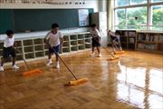 2学期の始まりに向けて、全校児童が縦割り範に分かれて、教室のワックスがけを行いました。