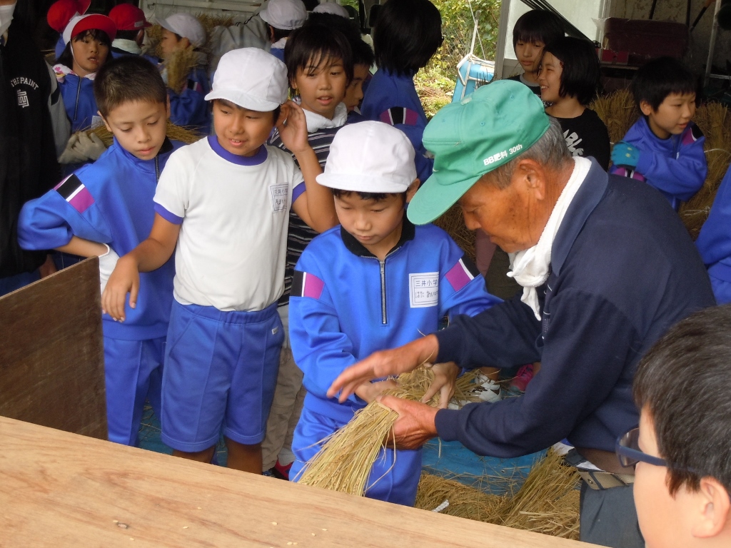 地域の方5名の協力を得て、全校児童が脱穀作業をしました。