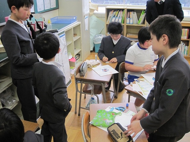 今日、昼休み時間に1年生から5年生が卒業生に送る色紙を縦割り班で作りました。どの班も5年生のリードの元で、みんな一生懸命に取り組んでいました。