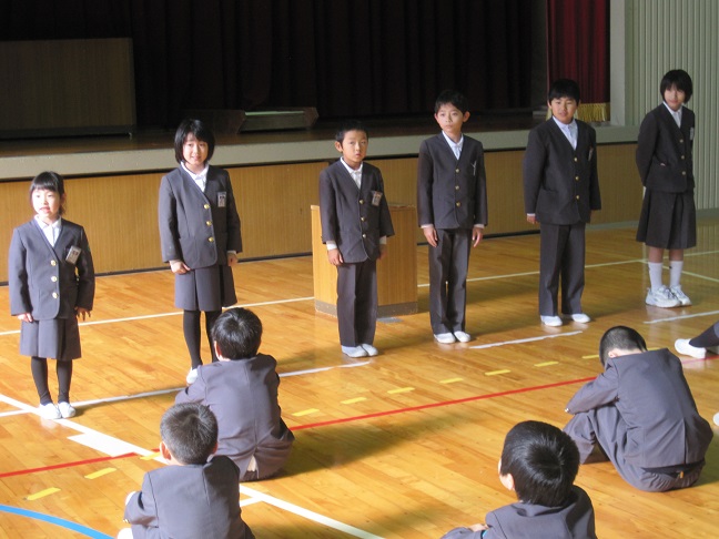 4時間目に校内テスト表彰と2学期の終業式を行いました。表彰では6年の岩﨑君が代表して満点賞の賞状を受け取りました。終業式では校長先生の話の後、各学年代表6人が2学期がんばったことを発表しました。学年が上がるごとに年相応の内容で、具体的にわかりやすく話すことができました。