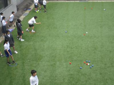 5年生が男女混合チームで仲良くボッチャに取り組んでいました。白いジャックボールに狙いを定めて青や赤の球を投げるのですが、それがなかなか難しいのです・・・。初夏の日差しが降り注ぐ中庭に、楽しそうな歓声が響いていました。