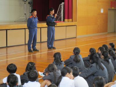校長先生のお話に続き、消防署の署員の方から、輪島っ子の避難訓練の様子についてお話がありました。