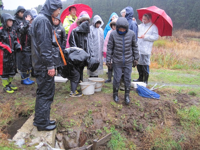 今日の3・4限目、まるやまで雨の中で水生生物を実際見て専門家の方から話を聞きました。その後に萩野さん宅でアエノコトに関する学習会をしました。
