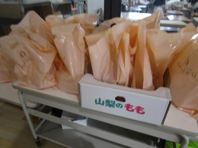 山梨県から北陸チャリティーを通して、大きな桃がたくさん届きました。この桃には「輪島中学校に通う児童・生徒が少しでも元気になるように」との願いが込められています。子どもたちの桃のようなほっぺがみるみるうれしさでピンク色に染まっていきました。袋に入れてつぶれないように大切に持って帰りました。