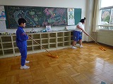 2日と3日にワックス掛けをしました。1年間お世話になった校舎の汚れをしっかりと落とし、気持ちよく新年度を迎える準備をしました。1日目は各教室です。机や棚などを全部廊下に出し、水拭きをした後、高学年がワックスをかけてくれました。かけた後の教室は入るのがもったいないくらいピッカピカになりました。