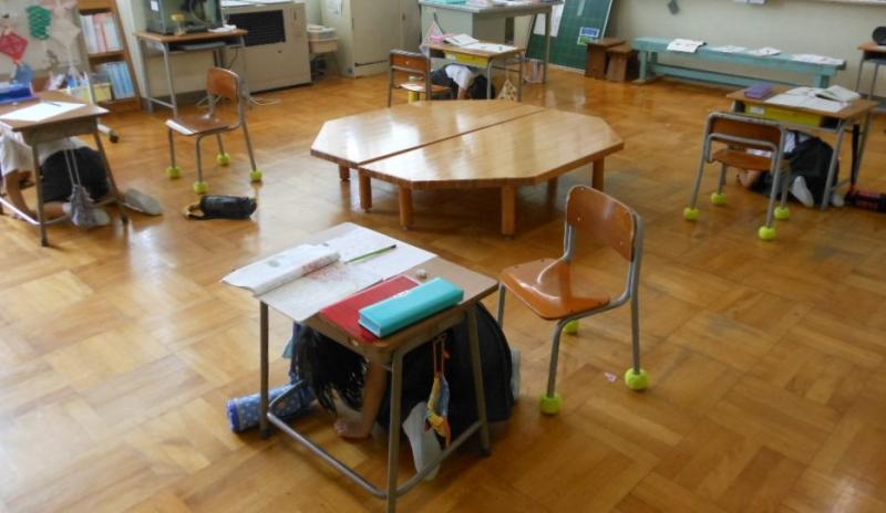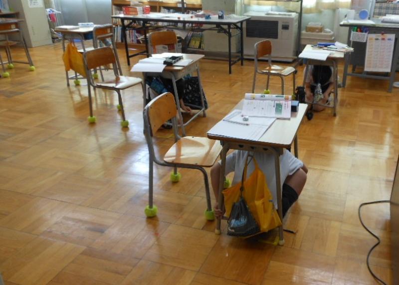 地震発生時に、自分の身を守る行動である「しゃがむ・かくれる・じっとする」の訓練です。