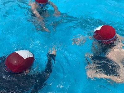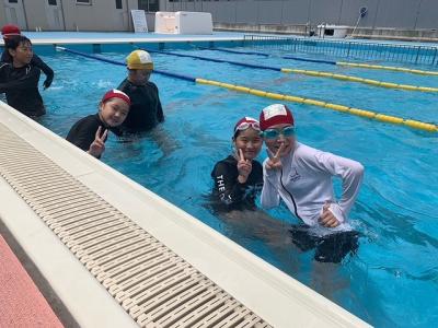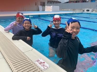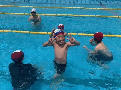 河井小学校のプールで、元気ハツラツで水泳活動に取り組む5年生です♪