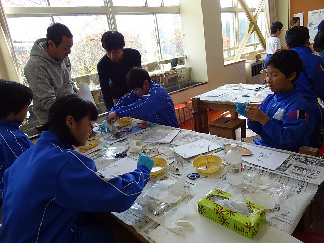 8日には、全校で木の器に、各児童オリジナルの図柄を漆を使って描きました。