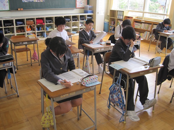 今日6年生は1限から4限目に国算A・国語B・算数B・理科のテストをしました。朝から緊張の連続で、4限目終了のチャイムが鳴ったときには開放感に満ちあふれた顔をしていました。