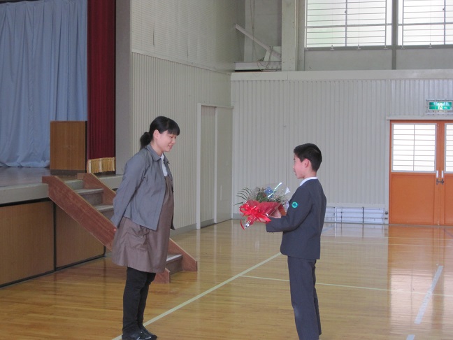 事務の先生が産休と育休のため長い休みを取ることになりました。次に学校勤務されるときには三井小学校に赴任するとは限りませんので、離任式をしました。儀式の形式にのっとって子どもたちにとっては緊張場面のある式となりました。