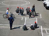 校庭に引いた道路図上で、恒例の交通安全教室が行われました。