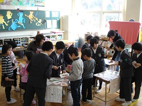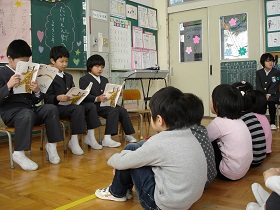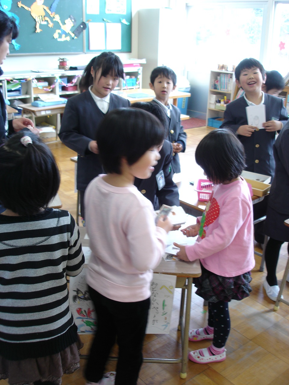 ました。最初にピアニカの演奏をしました。その後学校行事の紹介、行事作文の音読をし、おもちゃのお金を使ってお店やさんごっこをしました。園児は声を上げて喜んで参加していました。