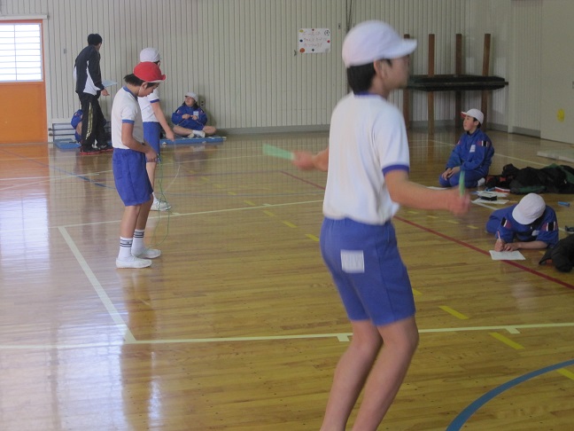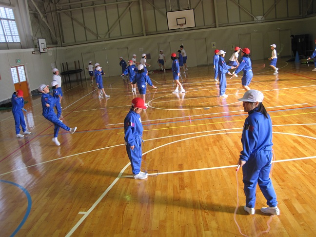 5限目になわとび大会がありました。最初に企画放送委員長の選手宣誓があり、次に1~4年と5年・6年と3つのグループにわけて両足跳び→わざ跳び①→わざ跳び②→わざの紹介の順に行いました。学年が上がるごとに難しい技が増えて、6年生になると後ろ交差二重跳びや三重跳びに挑戦する児童もいました。最後は、全員でお互いにできるようになった技を紹介しあい大会が終わりました。