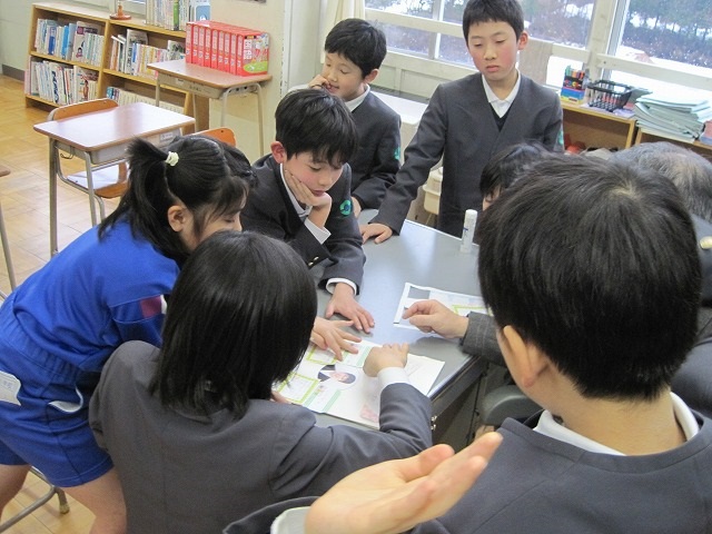 今日、昼休み時間に1年生から5年生が卒業生に送る色紙を縦割り班で作りました。どの班も5年生のリードの元で、みんな一生懸命に取り組んでいました。