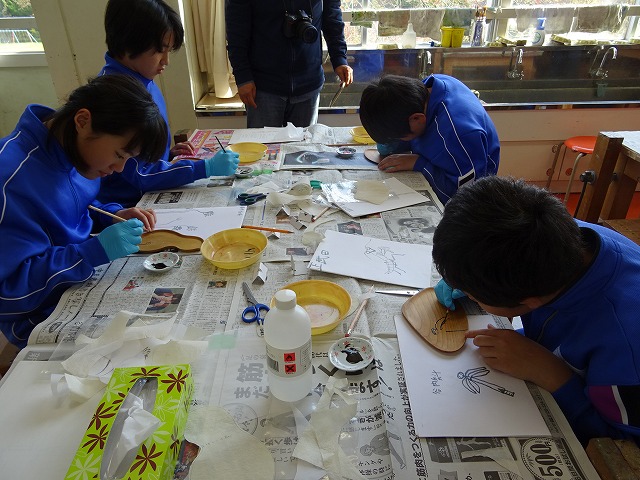 8日には、全校で木の器に、各児童オリジナルの図柄を漆を使って描きました。
