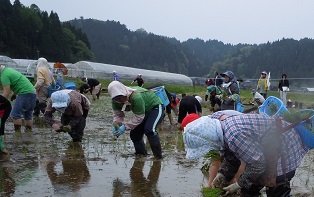 地域の方や高校生に協力してもらい、総勢84人で田植えをしました。おかげさまで、予定より大変早く終わりました。参加してくださったみなさんありがとうございました。