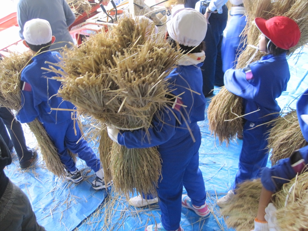 地域の方5名の協力を得て、全校児童が脱穀作業をしました。