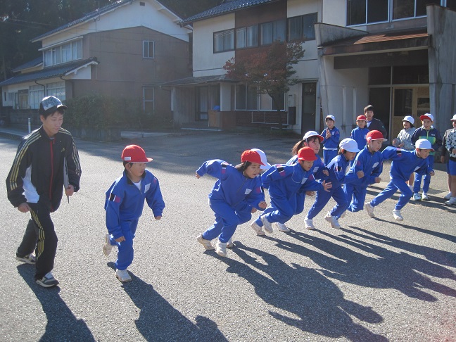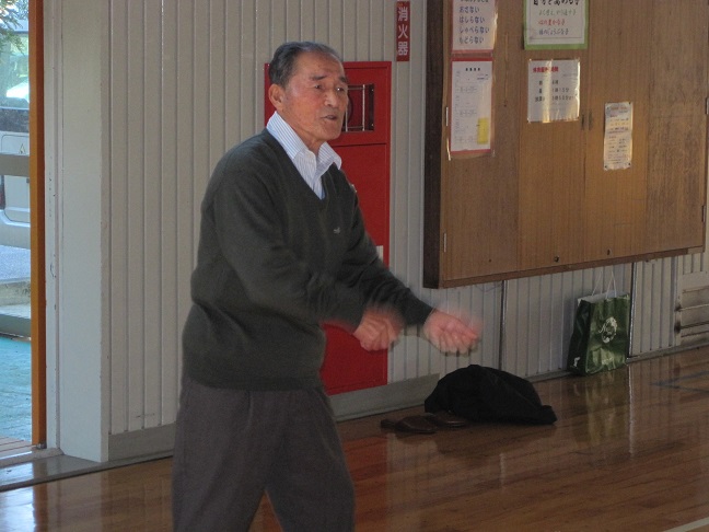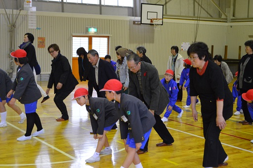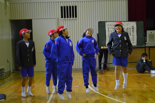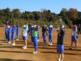 収穫祭で農作業でお世話になった方20名を招待して収穫祭をしました。最初に高学年が地域に伝わる民話や太鼓を披露し、その後、低中学年で農作業の表現運動をしました。その後、田植え歌に合わせて地域の方と一緒に踊りました。