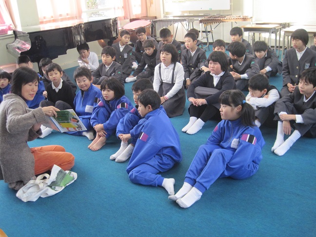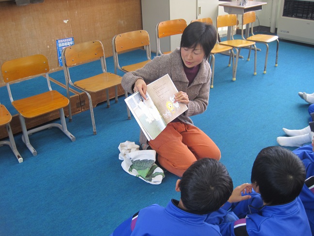 今日は読み聞かせの日です。三井地区のボランティアの方がきて下さいました。みんなこの日を楽しみにしています。