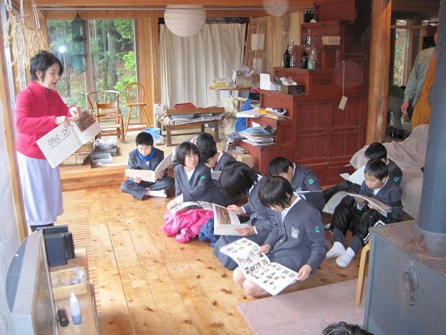 今日の3・4限目、まるやまで雨の中で水生生物を実際見て専門家の方から話を聞きました。その後に萩野さん宅でアエノコトに関する学習会をしました。