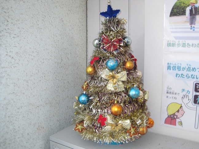 三井に今年度初めての積雪です。運動場は真っ白です。玄関にはクリスマスツリーが出てきました。