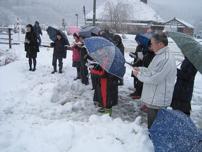 今日の3・4限目、まるやまで雨の中で水生生物を実際見て専門家の方から話を聞きました。その後に萩野さん宅でアエノコトに関する学習会をしました。