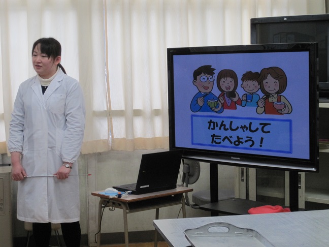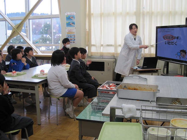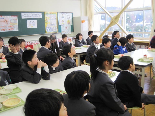 今日、給食時間に河井小学校の飯田先生が食育の指導に来て下さいました。子どもたちにいろいろな方に感謝しながら食べることの大切さを、わかりやすく話して頂きました。