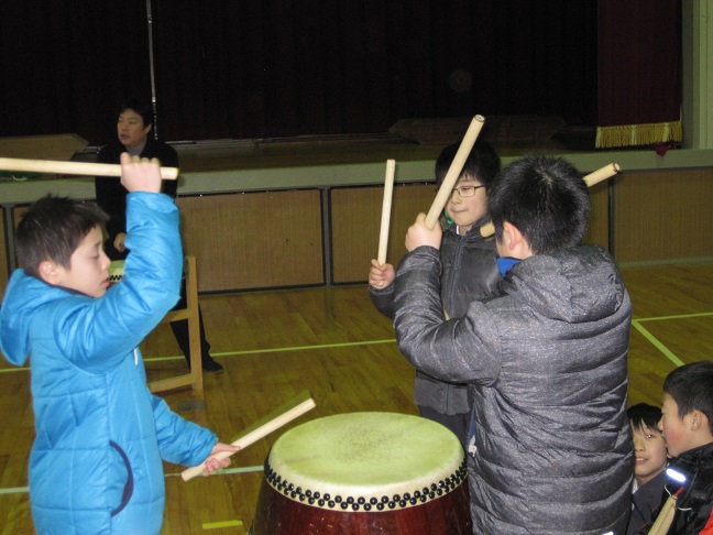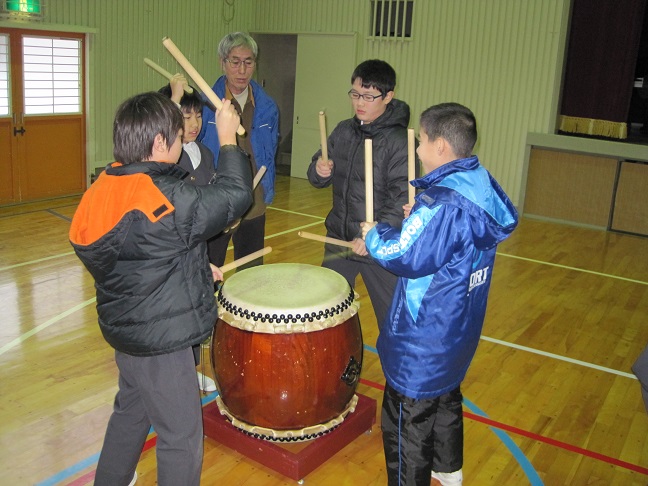 4月からクラブで権現太鼓を地域の方から習っています。最初、なかなか手が上まで上がりませんでしたが、今ではみんな自分の頭の上まで手が上がるようになってきました。
