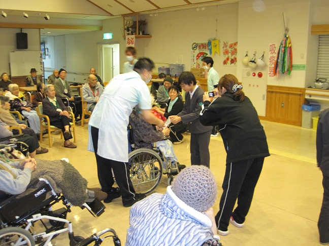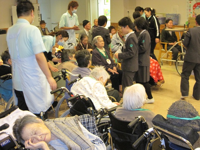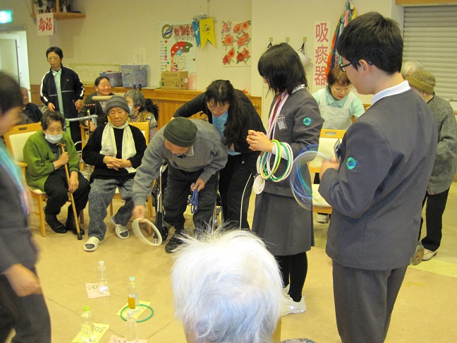 56年生が歌と3種類のゲームとメダルを50個用意してあての木園を訪問しました。歌とゲームの後、職員の方から施設の説明や車いす体験、介護用品の説明などをして頂きました。