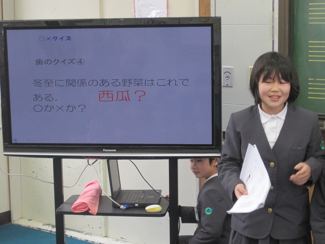 5年目に児童集会がありました。全校合唱の後、最初に年賀状コンテストの表彰があり、代表委員会から入賞者11名の代表が賞状を受け取りました。次に1・2年生の発表で手作りカルタの紹介と1年間で思い出に残った絵の発表しました。次に保健体育委員会の○×クイズで健康に関した10の問題が出され大いに盛り上がりました。最後の感想でも6人の児童が自主的に自分の思いを話すことができました。