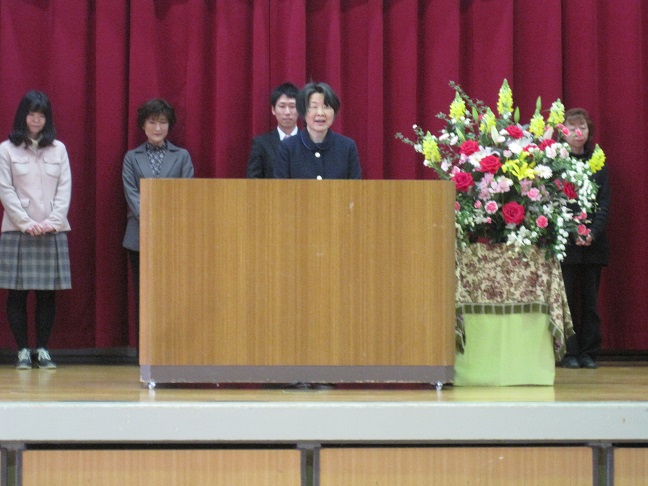 5限目に卒業生も来校して6人の先生方とのお別れの式をしました。最初に校歌を歌い、移動される先生方の紹介がありました。その後、壇上にて一人ずつ離任される先生方のお話がありました。子どもたちは皆、最後までしっかりと話を聞いていました。最後にステージ下で子どもたちがメッセージを読み上げ花束を渡しました。