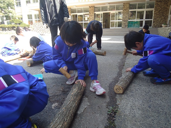 給食を食べ終えた昼休みに、椎茸の菌入れ作業と椎茸を取りに行きました。子どもたちは一人一本の木を割り当てられ、各自で菌入れを行いました。中には慣れた手つきで早々と作業を終える子や、低学年の世話をする高学年の姿が見られ、短時間でしたが、天気も良く楽しみながら菌入れの作業や収穫を楽しむことが出来ました。