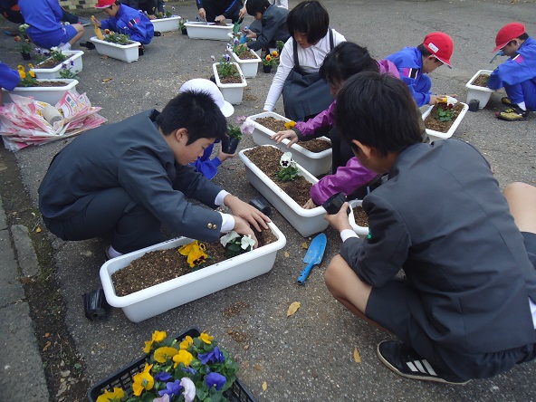 今日パンジーの苗とチュウリップの球根を植えました。パンジーは一人一プランターとし縦割り班で玄関前で作業をしました。低学年には大変な作業でしたが、高学年がしっかりと面倒を見てくれたので各班ともスムーズに苗植えができました。その後裏庭に移動し、各班の花壇に80個の球根を植えました。高学年は色が5色あったので植える場所を悩みながらもうまく下級生をリードして作業を終えることができました。来年どんな彩りで花が咲くか楽しみです。