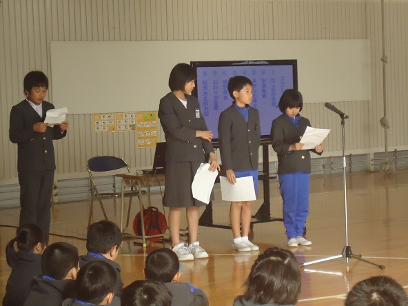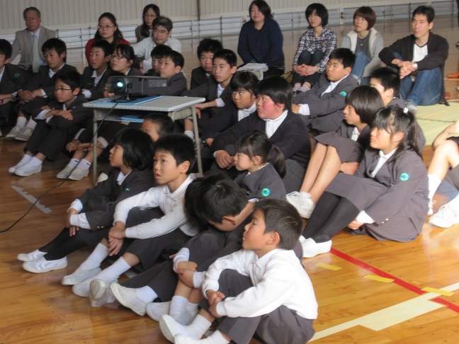 春から田んぼの農作業でお世話になった地域の方々を招待して収穫祭をしました。最初に5・6年生が農業に関する学習発表会をしました。高学年らしく日本の農業の現状や将来像も予想した内容でした。次に、田植えや稲刈り、脱穀の作文を各学級代表が発表しました。1~4年生はその後で一年間の農作業を音楽に合わせて踊りで紹介しました。その後、プレゼントとして小さな鉢植えと子どもたちのコメントが入った小さな額をプレゼントしました。地域の方々は児童のすること全てを目を細めながら楽しんでいました。