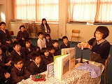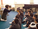 5限目に金沢の「はるかぜ文庫」を主宰している中橋範子さんをお迎えし、読み聞かせをしてもらいました。始めに中橋さんの小さな袋から出てきたのは、手作りの「へび いちのすけ」君。工藤直子さんの『詩集 のはらうた』から「あいさつ」を紹介してもらいました。可愛いへびに子どもたちは大喜び。つかみはOK!次に、この季節にぴったりの長 新太さんの『ふゆめがっしょうだん』からたくさんの木の芽を紹介してもらいました。そして、山の動物たちが今のような形や色になった謂われも入った絵本『天の火をぬすんだうさぎ』。ちょっと気分転換にわらべ歌『かたどん』でストレッチ。最後は部屋を少し暗くしてロウソクに火を灯してのお話『エパミナンダス』。どの子も興味津々に聞いていました。お話が終わると3月生まれの3人が代表で火を吹き消しました。