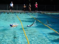 1・2年生は、浅いプールでけのびで何メートル泳げるかを競いました。