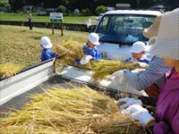 低学年は刈った稲を束ねます。