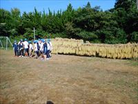 運動場の特設はざに稲の束を割ってかけます。