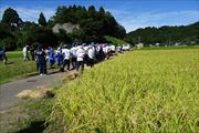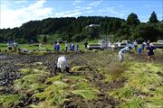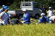 地域の方々、航空高校生と協力して、5アールの稲を約1時間で刈りました。