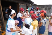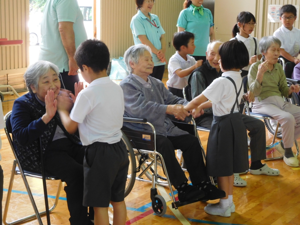 三井小学校の児童がみさき小学校の皆さんにおやつを配っています。