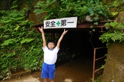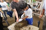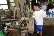 ③ 「珪藻土切り出し工場見学」 珠洲の珪藻土からできる焼器づくりの工場を見学しました。実際に珪藻土を大きな鑿で削らせてもらいました。