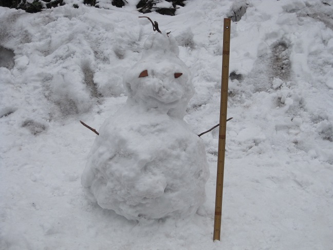 学校前の崖に、バスの待ち時間を利用して五・六年生が雪だるまを作っていました。横に立っているのは1メートル物差しです。とても硬い雪なのに上手にできあがっています。