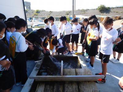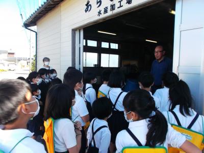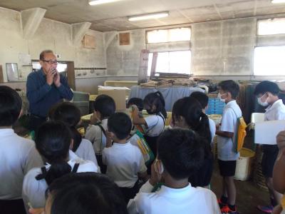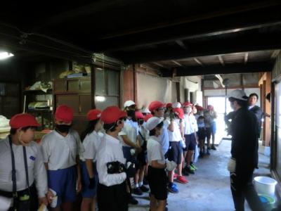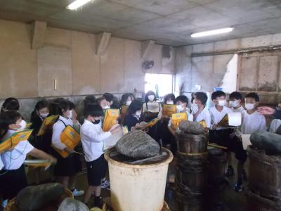 3年生が美川の特産、ふぐの子糠漬け、粕漬けを作っている工場に見学に行きました。いつから作られているのか、どのように作られるかなど積極的に質問をしていました。また、美川のおいしい湧き水も味わいました。