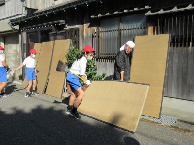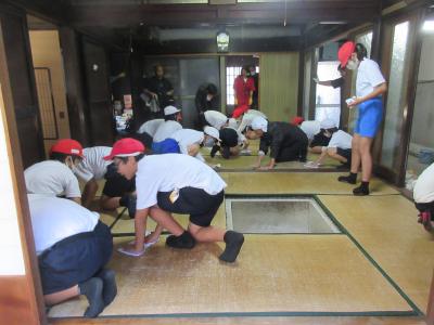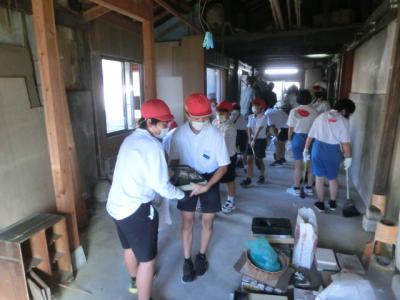 6年生が地域の人や大学の先生などと一緒に空き家を清掃しました。土間の掃き掃除、畳や戸の拭き掃除を終えるとあっという間にきれいになりました。