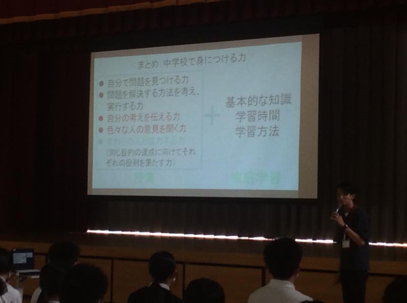 学習担当の田村先生から投げかけられる、「君たちが大人になったとき、どんな世の中になっているか」、「将来のために、中学校でどんな力を付けなければいけないか」、「その力を付けるために、今、どんなことを大切にすればよいのか」などの質問について全校で考え、授業や家庭学習で大事にしなければならないことについて全校で確認することができました。