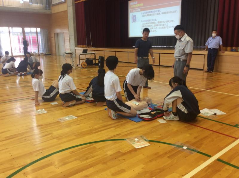 グループに分かれて人形を使いながら、心肺蘇生法やAEDの使い方などを、美川消防署の方々から丁寧に教えていただきました。