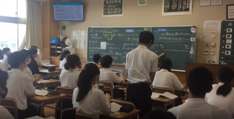 「個性の伸長」を主題とした平先生の授業では、3年3組の生徒たちが「自分の持ち味」「自分の伸びしろ」についてペアで自己紹介をし合った後、教材文をもとに議論し合いました。最終的には「人は、周りの人に認めてもらえないと自分の持ち味に自信を持てないのか?」という深い質問にそれぞれが考え、自分の意見を発表し合っていました。